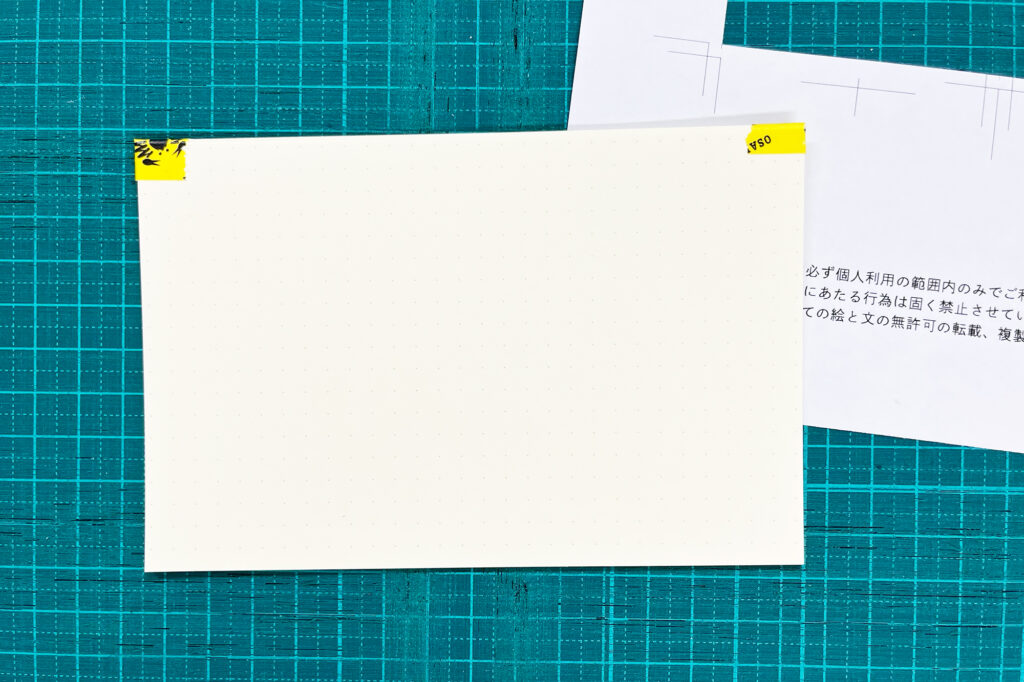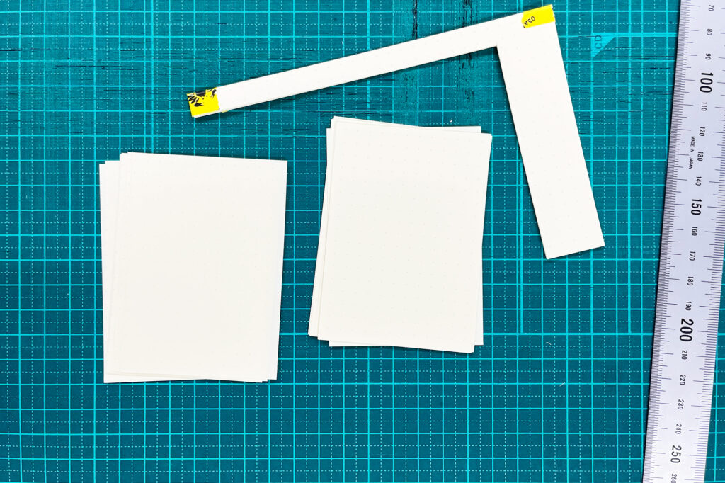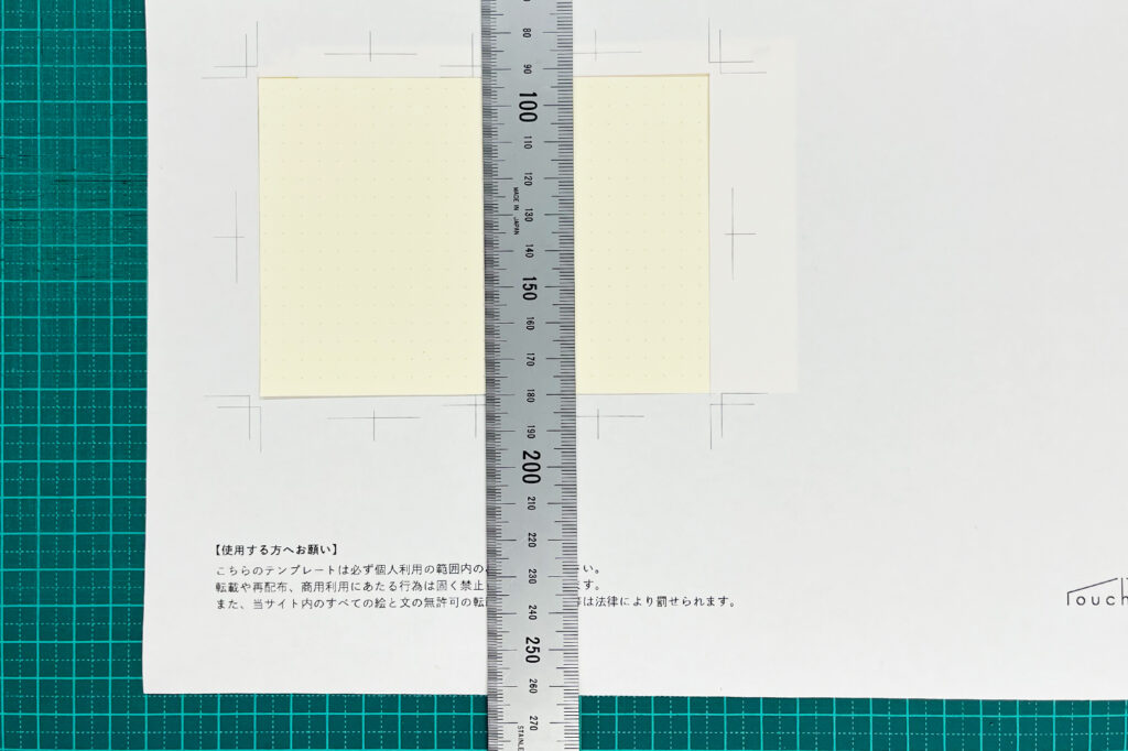 ひとかたまりにしたノートを下の写真のようにテンプレートの下に配置し、テンプレートに印刷されたトンボに沿って断裁します。
