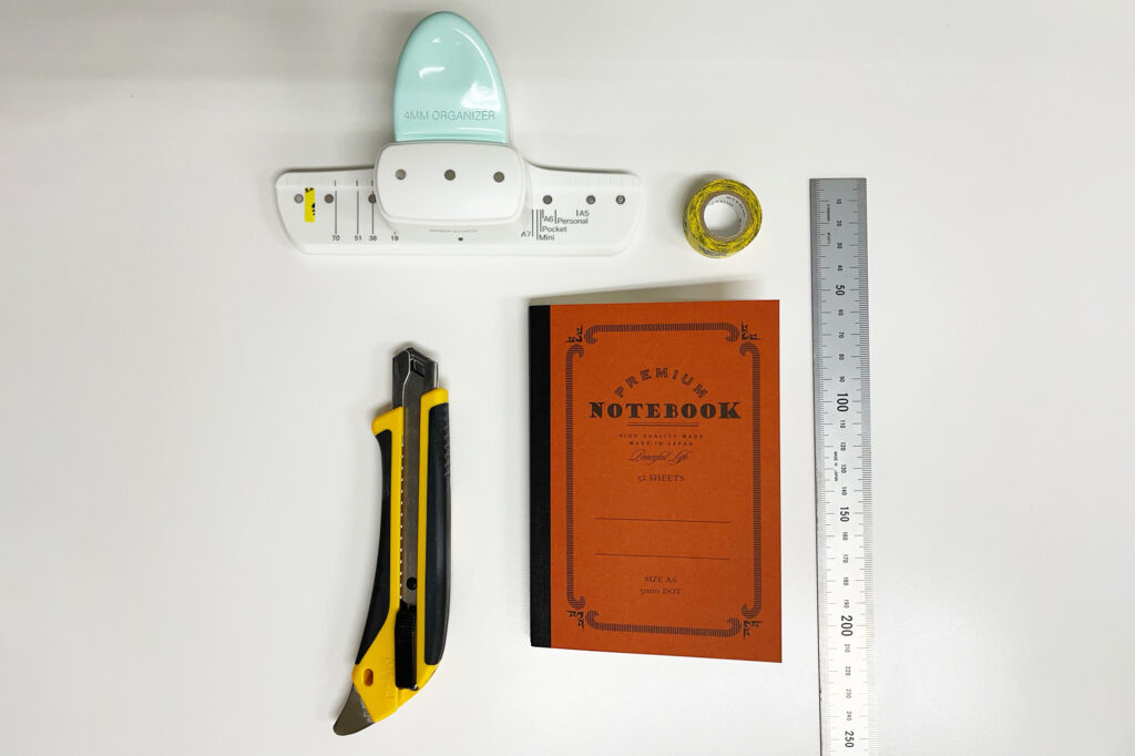 今回はダイソーのA6ノート(52枚、ドット方眼罫、プレミアムシリーズ、バーミリオン)を使用しました。