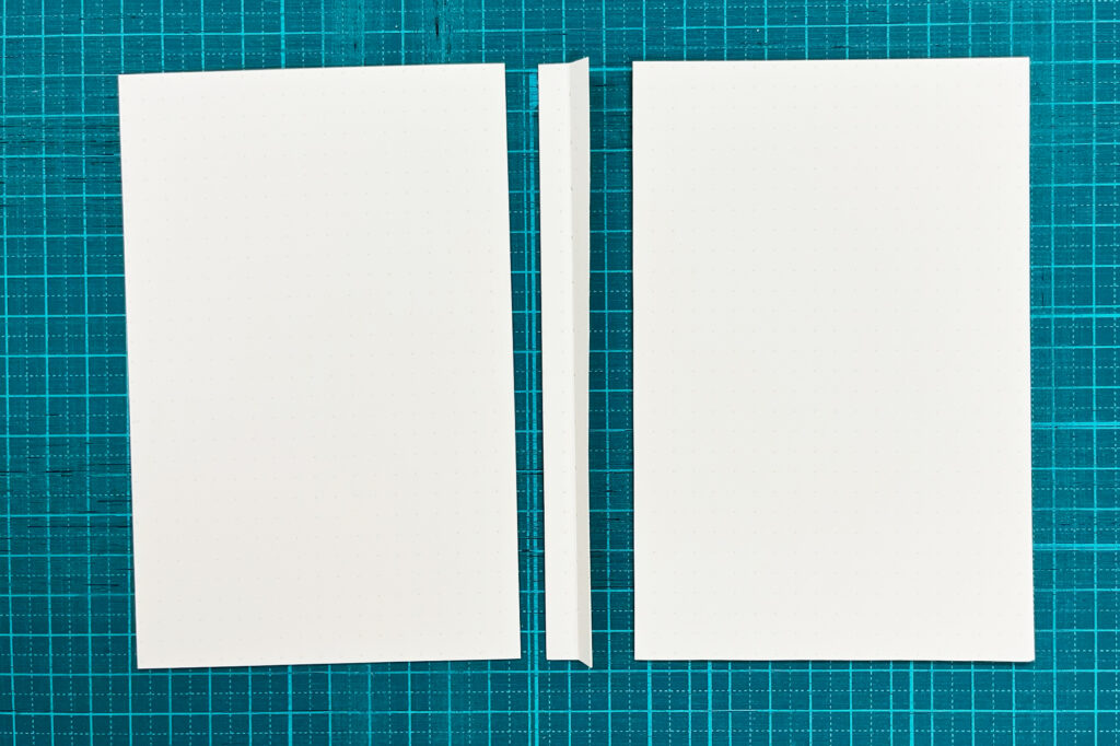 ノートに印刷されているドット方眼罫を参考にしながら、糸で閉じられていた箇所の左右を写真のようにカットします。