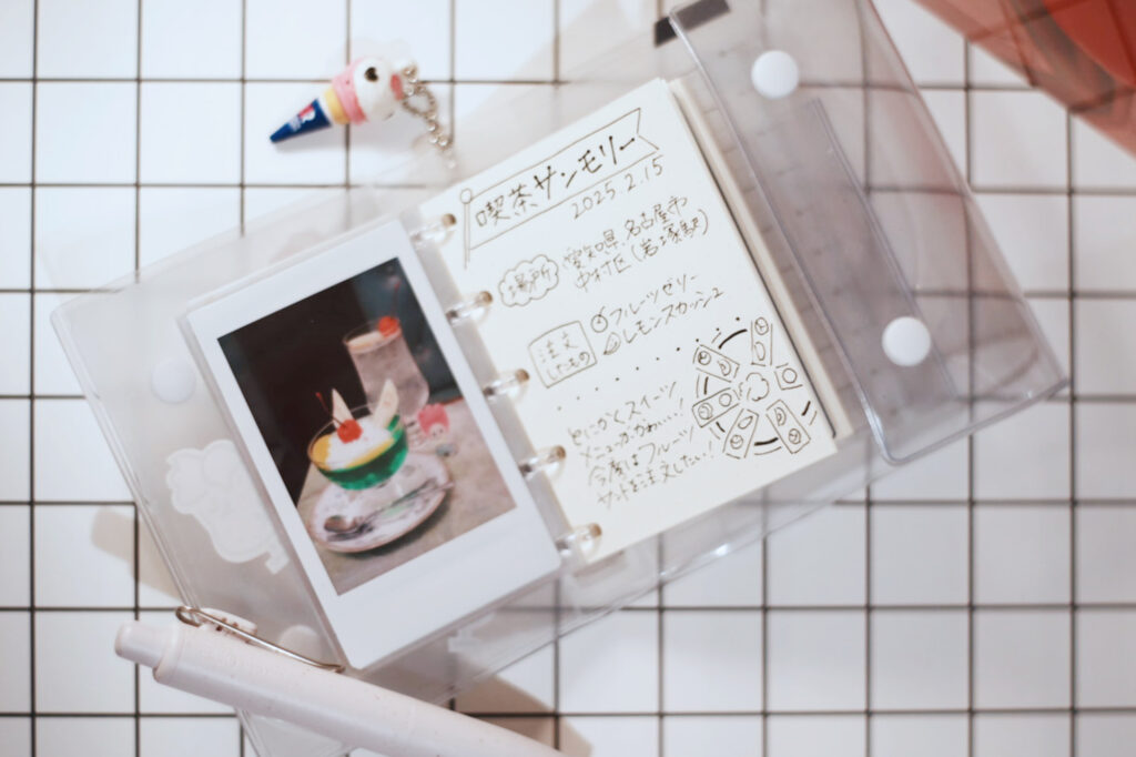 クリアポケットにチェキを入れ、ノートリフィルにメモを添えて喫茶探訪記録をつけてみました。他にも色々な活用方法があると思うので、ぜひ自作して試してみてください!